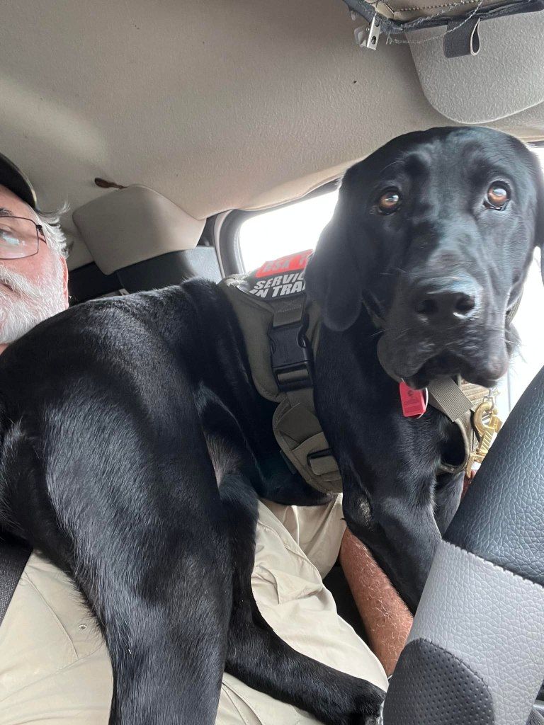 Bailey and Chris go everywhere together! Her place is in the front seat of the car, where she sits so proudly! She goes to meetings, appointments, doctor visits, and Rescue events together, and she helps her daddy make coffee and run his veterans podcast. Bailey is clearly every bit the businesswoman.