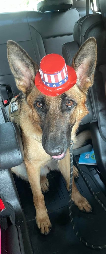 It is the 4th of July every day with this Service Dog Team! In addition to celebrating our country’s liberty, we also celebrate our service dog “Inde” – full name ViVA Independence! Inde was generously donated to The Rescue for PTSD by Dr Adam Scuik and his wife Katarzyna.