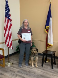 Congratulations to our recent Group Training Program Graduates, these Veterans have worked so hard training their dogs with our assistance at monthly class. These teams have passed their AKC Canine Good Citizen tests, the ADA Public Access test, and all of The Rescue for PTSD’s requirements to be service teams. Way to go all, we are so proud of you! We would also like to thank TomballRegionalHealthFoundation for all their support of our Group Program!